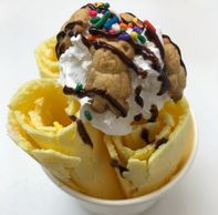 Mango ice cream topped with whipped cream, rainbow sprinkles, Teddy Bears and chocolate syrup