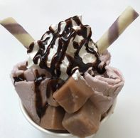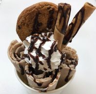 Chocolate ice cream mix chocolate cookie, topped with chocolate cookie, chocolate wafer roll, whipped cream and chocolate syrup.