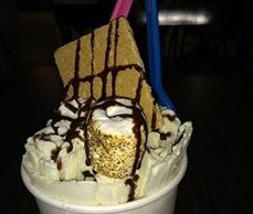 Banana ice cream topped with toasted marshmallow, whipped cream, Graham cracker, Teddy Bears and chocolate syrup