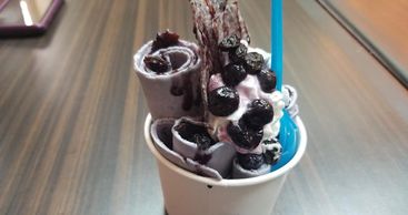 Blueberry ice cream with toppings: whipped cream, raisins, blueberries, chip and blueberry syrup