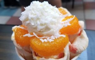 Peach ice cream with toppings: mandarin orange, whipped cream, coconut flakes, peach syrup, strawberry syrup