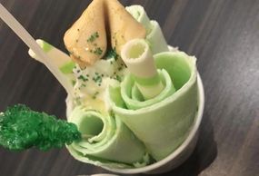 Honeydew ice cream topped with crystal candy, green sprinkles, fortune cookie, pandan wafer roll and honeydew syrup